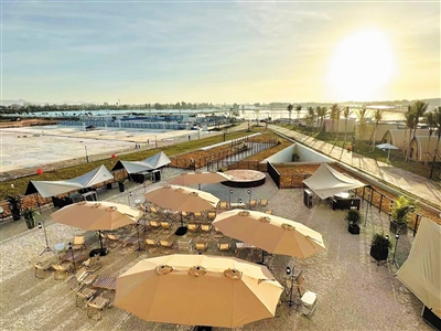 距离莺歌海盐场不远处,一座以“盐文化”为主题的旅游驿站——莺歌踏浪驿站,春节期间也引来众多游客休憩驻足。这座驿站是海南环岛旅游公路首批八个重点驿站之一,融合了住宿、餐饮、娱乐、购物等多种业态。参观完莺歌海盐场,来此享受发呆慢时光,已经逐渐成为一条备受游客青睐的旅游线路。