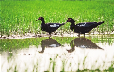 南国都市报4月8日讯(记者 刘孙谋 文/图) 清晨七点,在澄迈县福山镇大昌村的农田里,翠绿的水稻苗上挂着露珠,一对疣鼻栖鸭准时前来觅食。据了解,这对疣鼻栖鸭近期才现身在此,每天准时7点至8点半,到大昌村的农田里觅食,然后振翅高飞不见,不少爱鸟摄影师纷纷驱车赶来,拍摄它们的靓影。