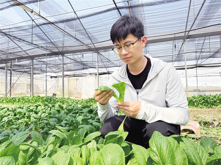 近日,在海南省农业科学院澄迈研究基地一处试验基地内,海南省农业科学院蔬菜研究所副研究员庞强强正蹲在地上,仔细观察大棚内设施叶菜的生长情况。阳光洒在绿意盎然的菜苗上,也照在了这位科研工作者的脸庞上。9年前,庞强强毕业之后,怀揣着“为海南造菜”的梦想来到海南省农科院蔬菜研究所,那时这位安徽青年未曾想到,自己将在海南岛这片热土上奉献自己的热血青春。