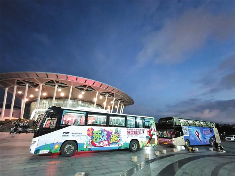 巴士车身绘满舞剧经典场景,车内配备专业讲解员,沿途停靠红色娘子军纪念园、中国(海南)南海博物馆等站点,将琼崖革命历史与地域文化故事娓娓道来。行程最终直达海南省歌舞剧院,形成“车行观景听史,下车赏剧共鸣”的沉浸式闭环体验。