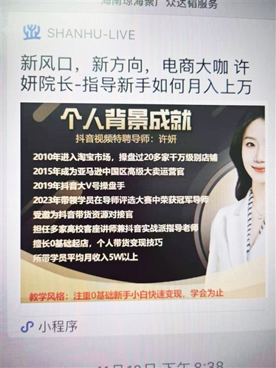 “培训老师称‘零基础’就可以开店,并培训我们带货技巧。”最令他心动的是,对方宣称其带出的学员月均收入都达到5万元,还提供了很多“成功典型案例”。