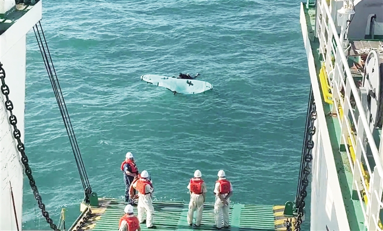 8时整,在精准的航向控制下,“银紫荆”轮稳稳靠近落水人员,船舶甲板部青安岗成员迅速放下加固型救生跳板,在大家默契配合下,落水男子被安全救至船舶。