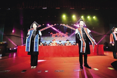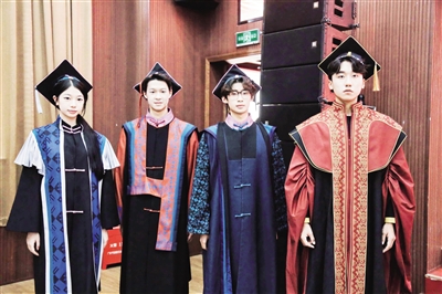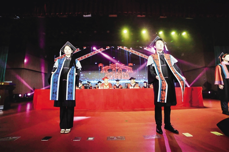 值得一提的是,该校美术学院师生团队精心设计的系列学位服惊艳亮相典礼现场,学位服以海南黎族深厚的服饰文化为内核,以黎族鱼鸟图腾为魂,用当代设计语言重新演绎,将“鲲鱼化鹏”的古老隐喻通过几何化的二方连续纹样织入学士服,寓意学子在自贸港大展宏图。