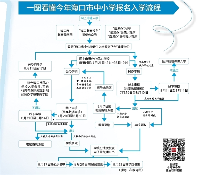 南国都市报7月20日讯(记者 杜倬荷 实习生 王茜茜 秦卓妍)7月20日,海口市各区公布义务教育学校招生工作实施细则(含公办、民办学校招生计划)。记者从海口市教育局获悉,网上报名时间为7月21日12时至28日12时,所有符合条件的适龄儿童少年申请就读本市公民办学校,均须在规定时间内登录“海口市中小学新生入学服务平台”申请学位,如实登记入学信息。