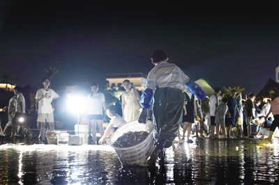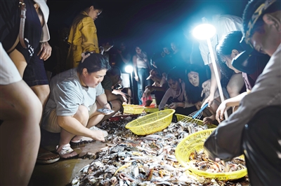 南国都市报8月21日讯(记者 颜乐驰 文/图)凌晨的海口荣山寮滩头,渔火如星缀在黑夜里。渔船归港的马达声划破寂静,渔民们拖着沉甸甸的渔获踏浪上岸,银鳞闪烁的鱼虾蟹堆成小丘。大海的味道在空气中弥漫,分拣、过秤、交易的吆喝声此起彼伏,灯火下忙碌的身影与涛声交织,这是属于荣山寮最鲜活的深夜烟火,将大海的馈赠化作人间的热腾。