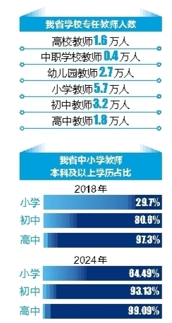 专任教师学历方面,小学、初中、高中教师本科及以上学历占比分别从2018年的29.7%、80.6%、97.3%提高至2024年的64.49%、93.13%、99.09%。近三年来,义务教育阶段本科以上学历专任教师比例以每年约5个百分点的增速稳步提升。中小学教师具有硕士以上学历的达4251人,是2018年的3.5倍;高校具有博士学历教师4286人。全省职业院校“双师型”教师占比达到56%。