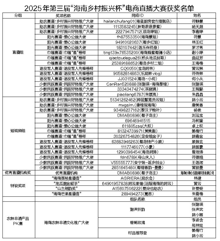 举办2025年第三届“海南乡村振兴杯”电商直播大赛,为众多有志于乡村振兴的主播提供了一个展示自我、实现梦想的平台。本届大赛特设“助农”“阳光”“巾帼”“少数民族”“退役军人”五大赛道,共吸引了149名选手踊跃参赛,期间成功举办三场专场直播,无数主播与机构用镜头架起“田间到云端”的桥梁,让海南特色农产品走向全国,让非遗文化在直播间焕发新生,更让乡村振兴的种子在每一次直播、每一条短视频里生根发芽。