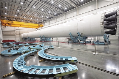 星际荣耀运载火箭总装总测复用工厂内设置的双曲线三号运载火箭机械模拟箭。(海报集团全媒体中心记者 王程龙 摄)