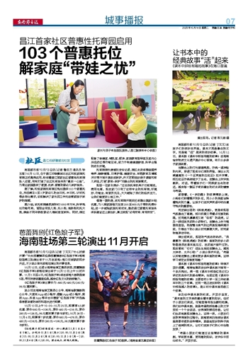 南国都市报10月13日讯(记者 鲁启兰 通讯员 钟玉莹)10月12日,位于昌江石碌镇城北社区和悦家园托育园正式揭牌启用,标志着昌江首家社区普惠性托育园投入运营,有效打通了社区托育服务的“最后一公里”,为周边家庭提供了便捷、优质、普惠的婴幼儿照护服务。