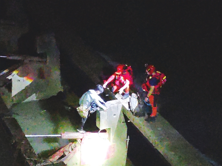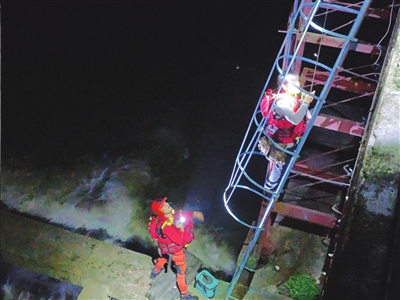 考虑到现场地形复杂,大坝底部平台与地面存在一定高度差,由2名经验丰富的救援人员穿戴好个人防护装备,小心降至被困平台,先为被困人员穿上救生衣,随后重点搀扶虚脱男子,通过通道缓慢转移至岸边安全区域;紧接着返回平台将另一名被困男子成功营救。