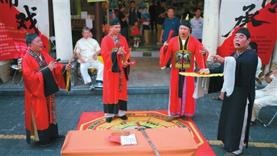 观展结束后,活动主场移至骑楼老街艺术馆门口。一场原汁原味的平安斋文戏表演在此精彩上演。四位表演者嗓音清越,仪态端庄。一旁,七位乐师组成的乐队以鼓、锣、唢呐等传统乐器进行伴奏,古朴的乐声、细腻的唱腔在老街回荡,将蕴含其中的古老故事与祈福愿景娓娓道来。精彩的演出不仅吸引了大量市民游客驻足围观,更引得不少外国友人纷纷举起相机记录。