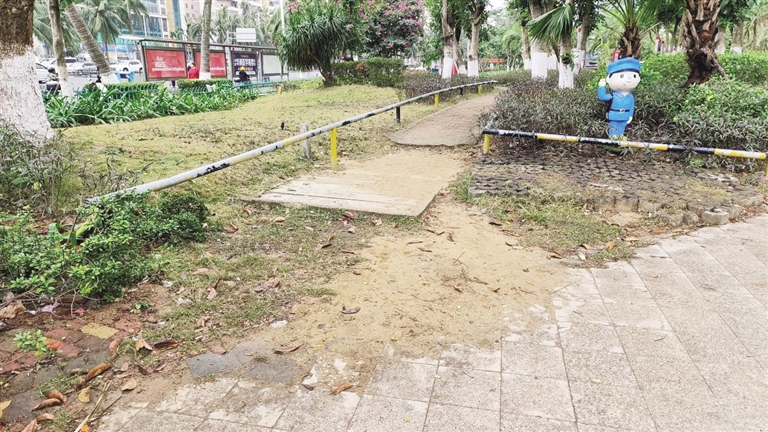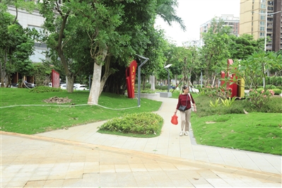 丽晶园(原名洛杉矶绿地)位于海口市滨海大道与丽晶路交叉口西北侧。10月21日上午,记者在现场看到,入口处崭新的标识牌格外引人注目。步入园内,平整崭新的地砖一路延展,昔日因裂缝带来的颠簸感不复存在。园内新植的树种枝繁叶茂,混凝土造型坐凳依着树荫摆放,几位市民正坐在凳上悠闲聊天;儿童游乐区里,色彩鲜亮的设施吸引着孩子玩耍。