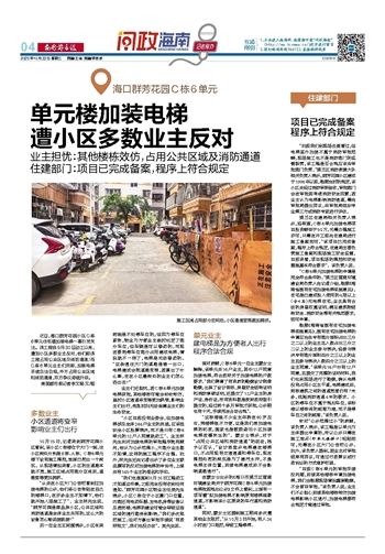海口群芳花园C栋6单元~~~业主担忧:其他楼栋效仿,占用公共区域及消防通道 住建部门:项目已完成备案,程序上符合规定