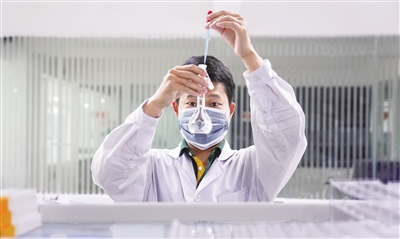 在海南双鹤的精密仪器室内,工作人员正进行产品的相关研究。据了解,海南双鹤共拥有5个生产车间、7条生产线,近期正式实现加工增值业务闭环的氯氮平口崩片便从其中的产线产出。