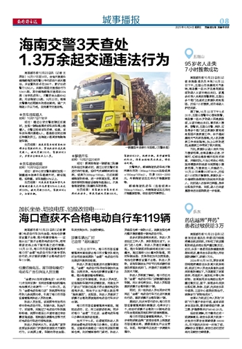 经过:澄迈公安交警在辖区巡查时,发现一辆轻型厢式货车后车厢上载着人,交警立即将该车拦停。经查,该车后车厢内搭载4人,都是前往附近园区种植的员工,且驾驶人杨某穿拖鞋驾驶车辆。