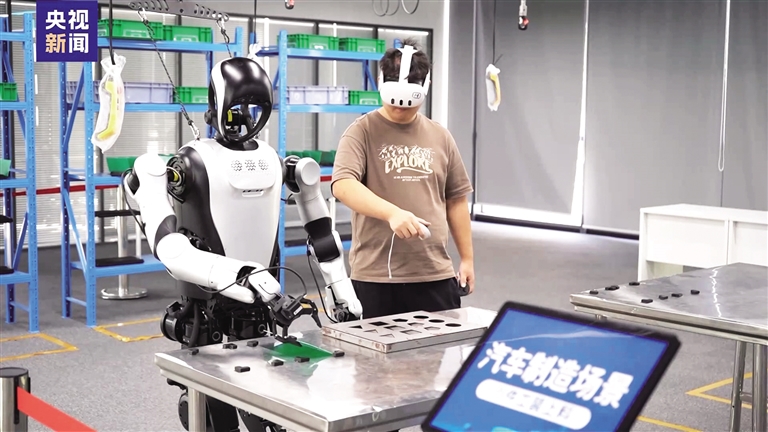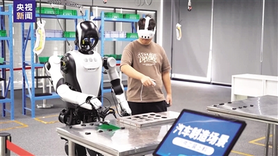 在这里,还会看到网红机器人“夸父”(Kuavo),它有1.66米高呢!“夸父”在不同的场景里刻苦练习,就像一个小学生在认真做作业一样。人们通过VR眼镜和动作捕捉系统这些高科技装备,帮助机器人学习怎么把空箱子放回仓库、怎么分拣材料、怎么称重打包,还有怎么把产品装进箱子里。