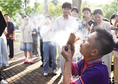 “黎族钻木取火技艺”代表性传承人现场钻木取火。