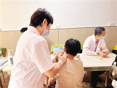 中医关怀区,中医医生耐心为每位长者量血压、搭脉问诊,还现场演示耳穴压豆疗法。