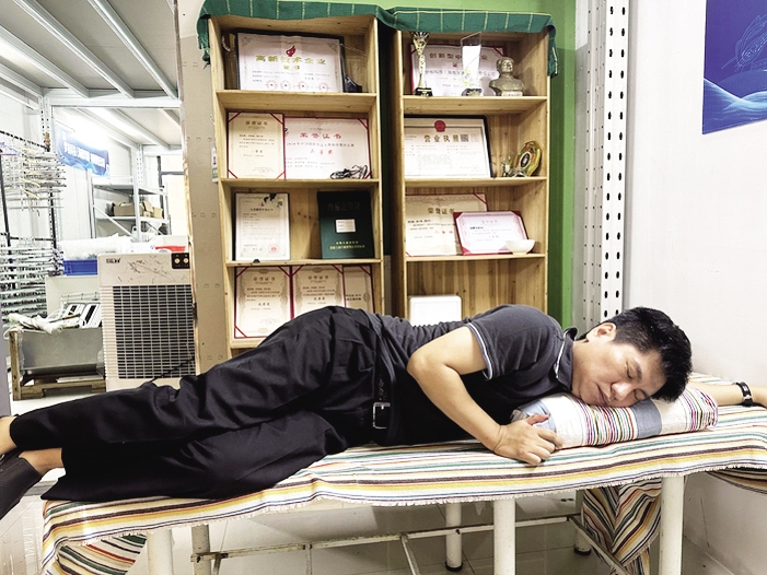 一个深夜,他把家里两个大小不一的枕头用布带绑在一起,试着侧躺——肩膀不压了,颈椎也放松了。他立刻爬起来拆枕头、改结构。从人体脊柱弯曲数据,到复合型内胆的填充物,经过无数次改进,连体枕头终于成型,趴卧、侧卧、躺卧……多种睡姿兼容。唐浩雄也由此申请获得了自己第一个国家发明专利。