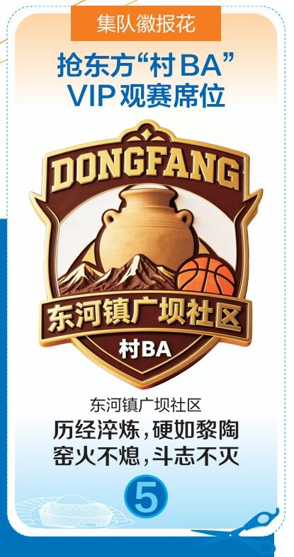 开赛前,可凭已收集的队徽报花前往“赛事服务中心”兑换相应奖品。 (1)集齐9枚队徽报花,可兑换“村BA”专属礼品一份,限60份,先到先得。 (2)集齐全套12枚报花,可兑换一张“精英观赛兑换券”,凭此券可进入场外VIP嘉宾区及场内中央VIP观赛区观赛。数量有限,先兑先得,兑完即止。