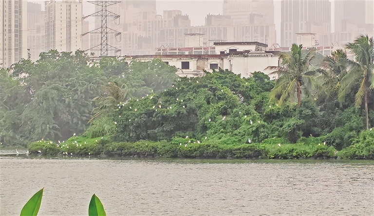 南国都市报11月4日讯(记者 王康景 文/图)近日,有市民报料称,海口红城湖公园内来了不少鸟类,大部分是白色的大鸟,它们栖息在湖心岛上,频繁飞掠过湖面觅食抓鱼,看上去既美丽又热闹。