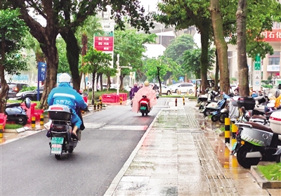 南国都市报11月5日讯(记者 王康景 文/图)11月4日下午,海口依旧雨下不停。“这回终于不用老是在湿滑的大理石板砖上骑行了,稳稳的沥青路走起!”在海口龙昆南路靠近灵龙大厦位置的人行道上,来来往往的电动车从刚刚完成大理石地板砖改沥青的路面上驶过,市民点赞这样的改造让雨天骑车出行不再担心“滑倒”。