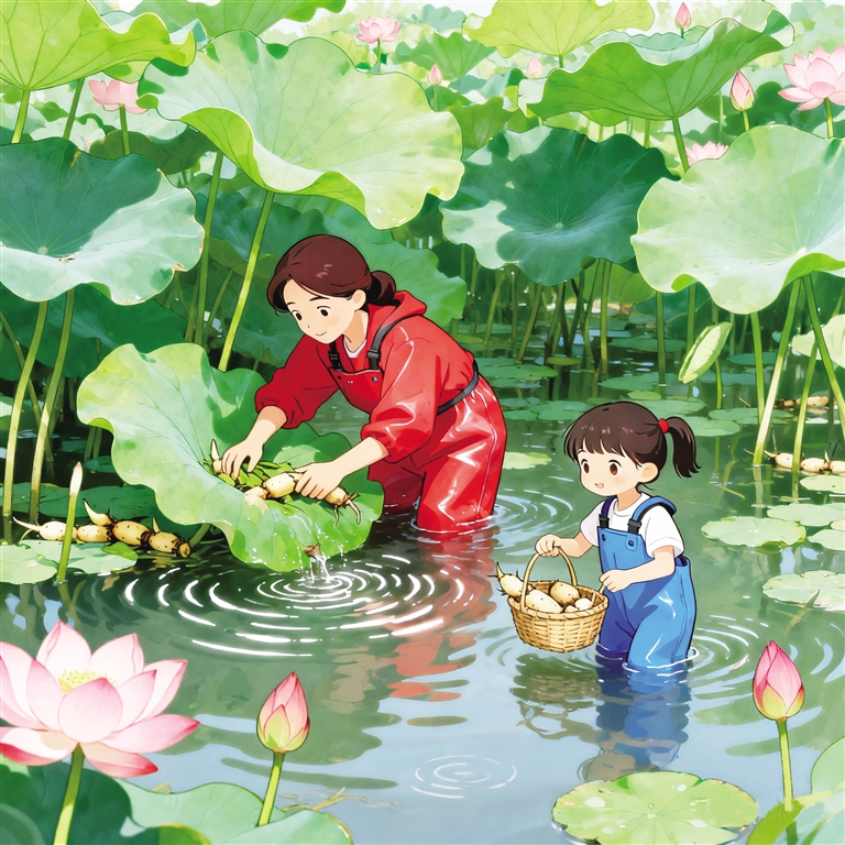 休息片刻,妈妈笑着提议:“咱们去采莲藕吧,今年的雨水足,藕肯定长得壮实。”我一听,兴奋得跳了起来,连忙拉着妈妈的手往塘边跑。爷爷早已为我们准备好防水服和小木桶,我迫不及待地穿上厚重的防水服,跟着妈妈小心翼翼地走进荷塘。