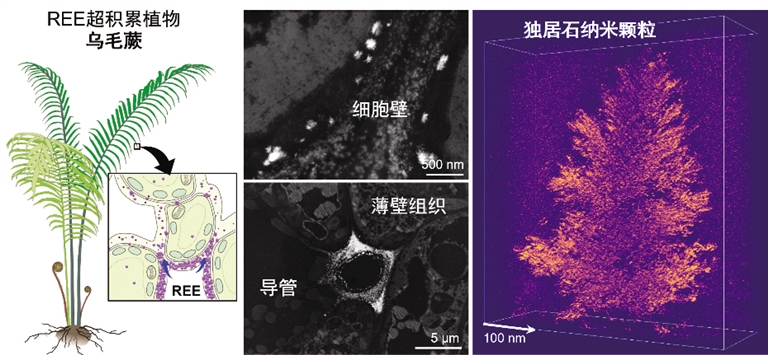 在这次研究中,科学家还看到了更有趣的画面:在乌毛蕨叶子里的维管束和表皮组织中,从土壤里吸来的稀土元素会变成细小的纳米颗粒沉下来,然后慢慢结晶,最后就变成了“镧独居石”。原来这是乌毛蕨在保护自己呢。就像我们把有毒的东西装进密封的盒子里一样,植物会把可能伤害自己细胞的稀土离子,稳稳地“打包封存”进矿物结构里,这样稀土就不会伤害它,这就是植物的“解毒”小妙招。