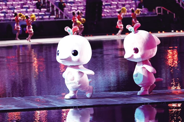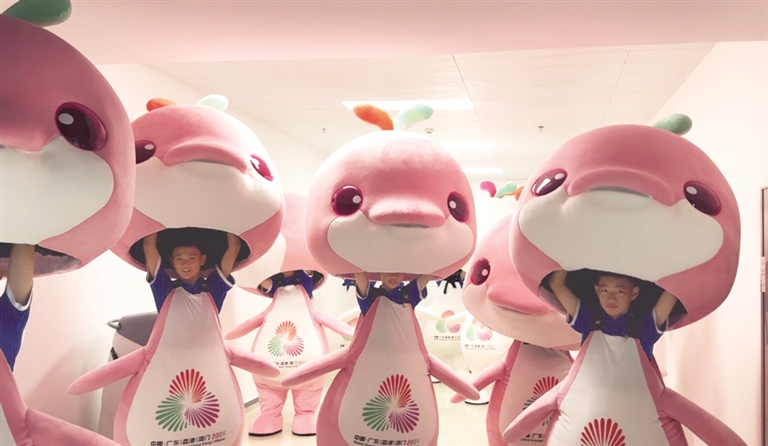 为什么要把中华白海豚设计成吉祥物呢?因为它们代表着我们的家乡、我们的故土,还有我们对大海的热爱。这次全国运动会是在大湾区举办的,大湾区有很多城市,就像一个大家庭一样。“喜洋洋”和“乐融融”头顶的三色水柱,就是这个大家庭的标志:红色是广州的木棉花,紫色是香港的紫荆花,绿色是澳门的莲花。这三种颜色连在一起,就像大湾区的三地手拉手,一起向前走呢!