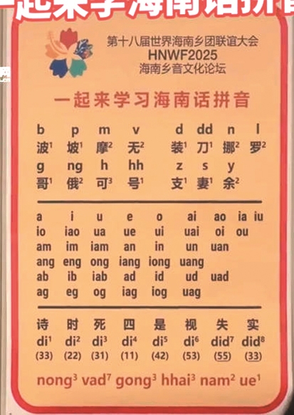 南国都市报马来西亚槟城11月16日讯(特派记者 韩星)“‘nong vad gong hhai nam ue ’,拼读起来就是‘我会讲海南话’!”11月15日,在马来西亚槟城,第十八届世界海南乡团联谊大会海南乡音文化论坛现场,海南话拼音学习海报吸引众多海南乡亲驻足了解,尝试拼读。