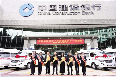 发车仪式上,建设银行海南省分行向受赠医院代表发放快车“金钥匙”,4辆“母亲健康快车”医疗车辆带着护航健康的光荣使命,携爱启程。