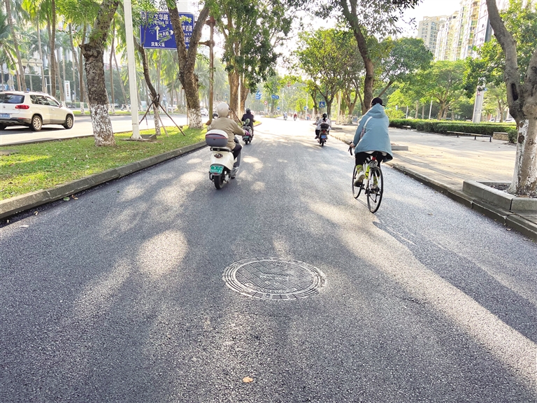 11月25日,记者回访现场看到,滨海大道牡丹路段的非机动车道改造工程已完工。崭新的沥青路面平整光滑,原本高低不平的井盖问题得到解决,市民骑行体验明显改善,非机动车通行井然有序。