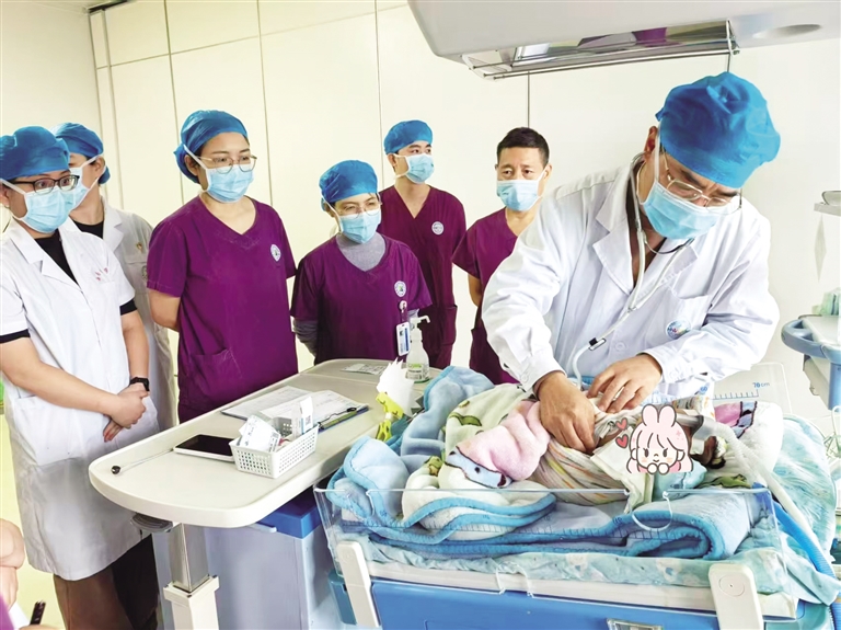 小惠转至省妇儿中心后,心脏相关检查结果提示,小惠合并粗大的动脉导管未闭。省妇儿中心儿童重症医学科、儿童心胸外科、营养科等多学科专家迅速集结,大家围绕孩子的呼吸支持策略、心脏手术时机、营养支持方案等关键问题反复研讨,为其量身定制了“先稳生命体征、再除心脏隐患、全程营养护航”的阶梯式救治方案。