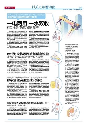 新华社海口12月13日电(记者陈凯姿)针对电解水制氢成本高的挑战,海南大学联合中国科学院宁波材料技术与工程研究所,突破直接电解天然海水制氢提镁技术,实现氢气和氢氧化镁联产,大幅降低氢气生产成本。北京时间12月12日,相关研究成果在国际学术期刊《自然·通讯》发表。