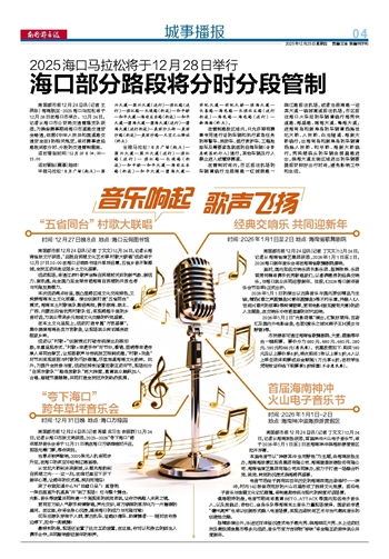 南国都市报12月24日讯(记者 王燕珍) 海南航空·2025海口马拉松将于12月28日在海口市举办。12月24日,记者从海口市公安局交通管理支队获悉,为确保赛事期间海口市道路交通安全畅通,依据《中华人民共和国道路交通安全法》的相关规定,将对赛事途经路段采取分时、分段的交通管制措施。