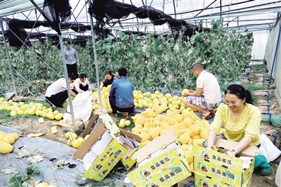 南国都市报1月6日讯(记者 余育桑 通讯员 邓捷)近日,五指山市毛阳镇毛兴村新成立的蜜瓜试种及提质增效技术集成示范基地的大棚里弥漫着阵阵果香,藤蔓间果实累累,村民们有条不紊地采摘、打包成熟的蜜瓜。