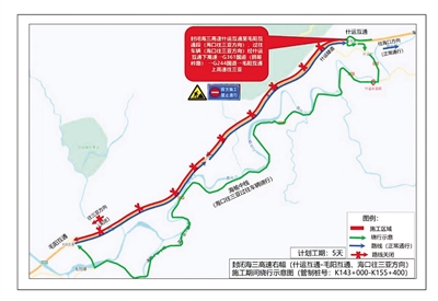 具体如下:2026年1月12日至2026年1月16日,封闭G9811海三高速K143+000至K155+400右幅(海口往三亚方向)车道,由海口往三亚方向的车辆从什运互通下高速→G361陵昌线(鹦哥岭路)→G224海榆中线→毛阳互通重新上高速往三亚方向。