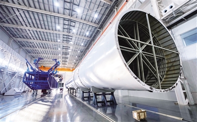 走进位于文昌国际航天城的星际荣耀运载火箭总装总测复用工厂A厂房,一架双曲线三号运载火箭模拟箭横亘眼前,引人注目。