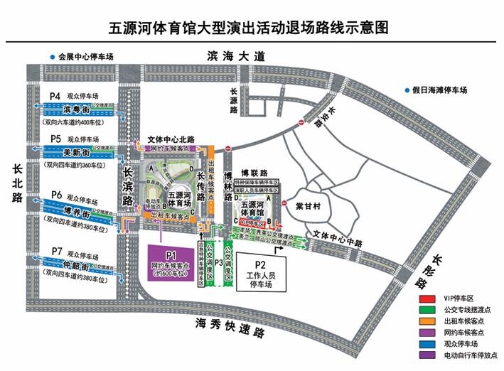 同时,在星茂购物中心,P4、P5停车场,P6、P7停车场开通3条免费公交摆渡线,投放8辆公交车,直达五源河体育馆,观演群众可就近停车,摆渡前往。