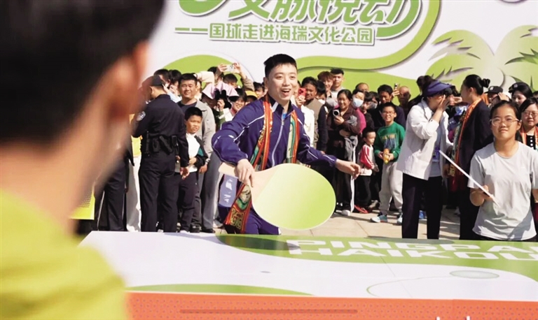 上午10时许,海瑞文化公园迎来了国乒队员林诗栋、陈垣宇、全开源、曾蓓勋、蒯曼、陈幸同、王艺迪。趣味乒乓互动环节创意十足,国乒队员手持巨型球拍和极具海南特色的迷你椰壳球拍与市民对战,即便使用特殊球拍,依旧展现出专业的球技,引得现场观众阵阵叫好。