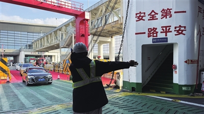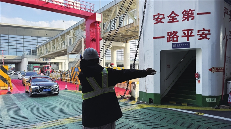 “现在人手比较紧张,我从1月19日上船到现在都没下过船,一直按照船长和大副的要求做着各项船内工作。”李永彬介绍,水手的日常工作包括装车、驳岸、驾驶台值班等,春运启动以来工作量更是与日俱增。“昨天夜间也有航行任务,熬了个夜,上午休息了一会后中午又回到岗位上。不过我们都是年轻人,这都不算什么。”李永彬和记者简单说了几句,随后又投入到进船车辆的指挥引导当中。