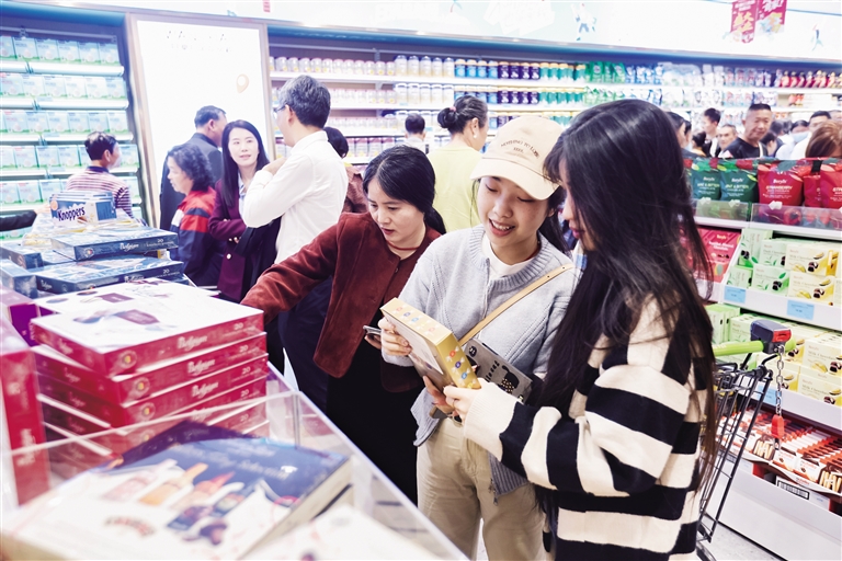 “商品琳琅满目,都是精致的进口产品,买年货又多了一个新选择。”海口市民于晗的购物篮里塞得满满当当。