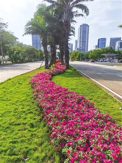在海口滨海大道和国兴大道等主干道绿化带,此时已是花团锦簇,多个标志建筑的摆花布景更是别出心裁、形态各异。有的如飞龙,有的如彩带,有的如棒棒糖,喜庆的氛围盈满街头。