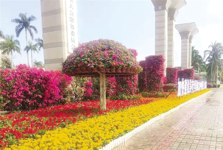 马踏春归花似锦,莺啼岁新景如诗。“摆花造景”扮靓椰城,让市民游客共享欢乐祥和新春。(康景)
