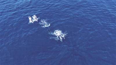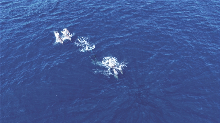 十余只海豚在三亚蜈支洲岛海域逐浪撒欢。