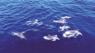 当日11时26分,景区彩虹拖伞船长谭章跃像往常一样,驾船在蜈支洲岛近海海域作业。突然,距离船身约二三十米的海面上泛起阵阵异样涟漪,“一开始我还以为是‘鱼打水’,定睛一看,一群海豚正在船头前方撒欢呢!”