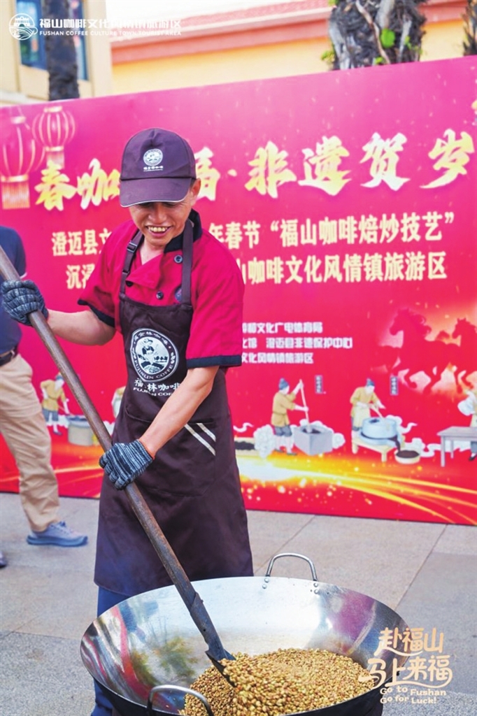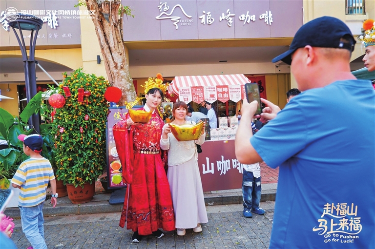 本次春节活动中,福山咖啡文化风情镇跳出“观景点+购物店”的传统模式,将百年咖啡文化与新春年俗深度绑定,打造出一批可参与、可互动、可传播的沉浸式消费场景。“集五福全民任务”串联起咖啡品鉴、非遗体验等打卡点,让游客在游戏中感受文化魅力;“炭火焙炒咖啡豆体验”让亲子家庭亲手参与咖啡制作,解锁“从种子到杯子”的完整体验;“马上有好市” 创意市集汇集咖啡文创、本土小吃,延伸消费链条。