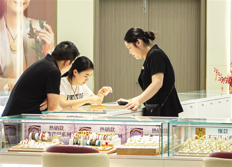 黄金素有“硬通货”之称,在保值增值方面受到消费者普遍认可。近期,随着金价持续走高,黄金市场的消费热情依旧高涨。在这一背景下市场上涌现出越来越多设计独特的“一口价”黄金饰品,逐渐成为消费者关注的焦点。然而,记者近日走访海口多家品牌金店发现,这类“一口价”黄金饰品的克重信息有的未标注,有的被隐藏在不起眼的位置。部分商家在消费者问及时也语焉不详,回避透露具体克重。