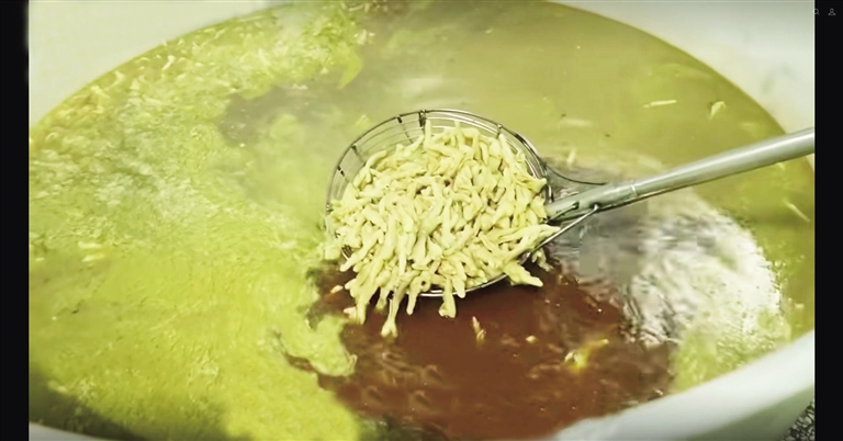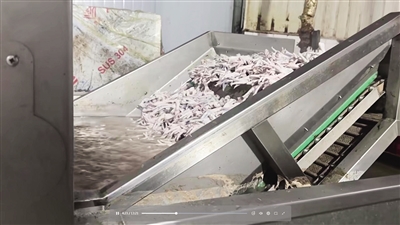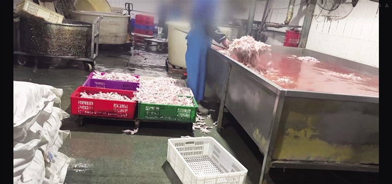 央视“3·15”晚会曝光企业用双氧水漂白鸡爪。(视频截图)