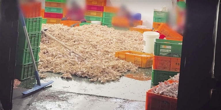 网红鸡爪 生产车间臭气熏天鸡爪堆地上踩脚下,双氧水随便用